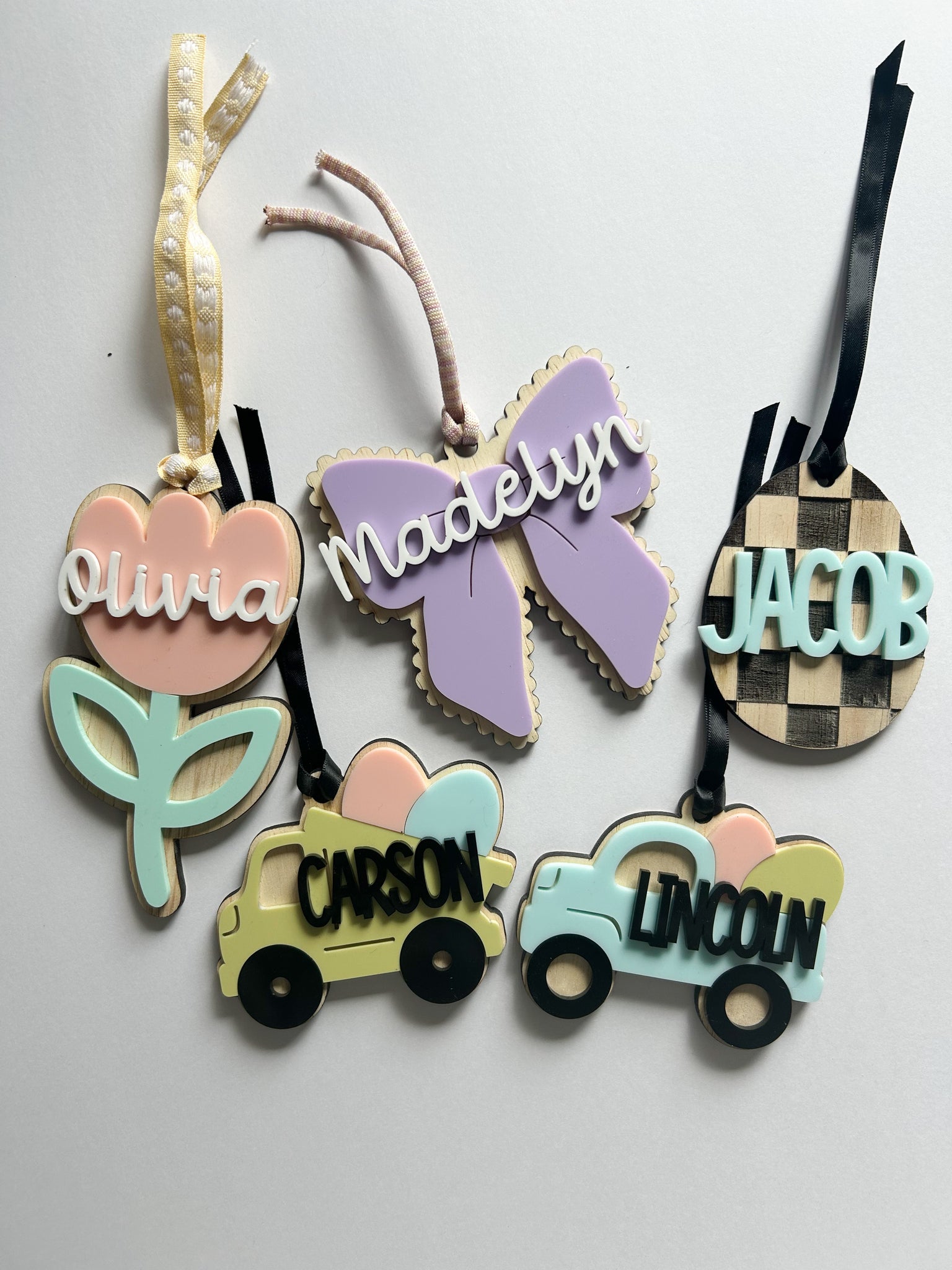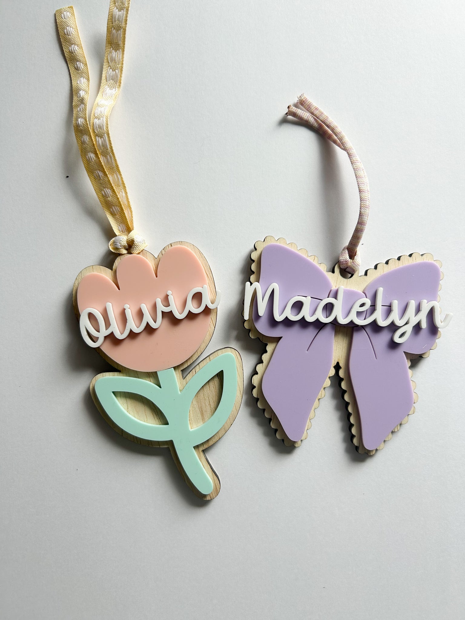Choose from the tulip or bow. Tags measure about 4” x 3”. Made of wood and acrylic. Other colors available